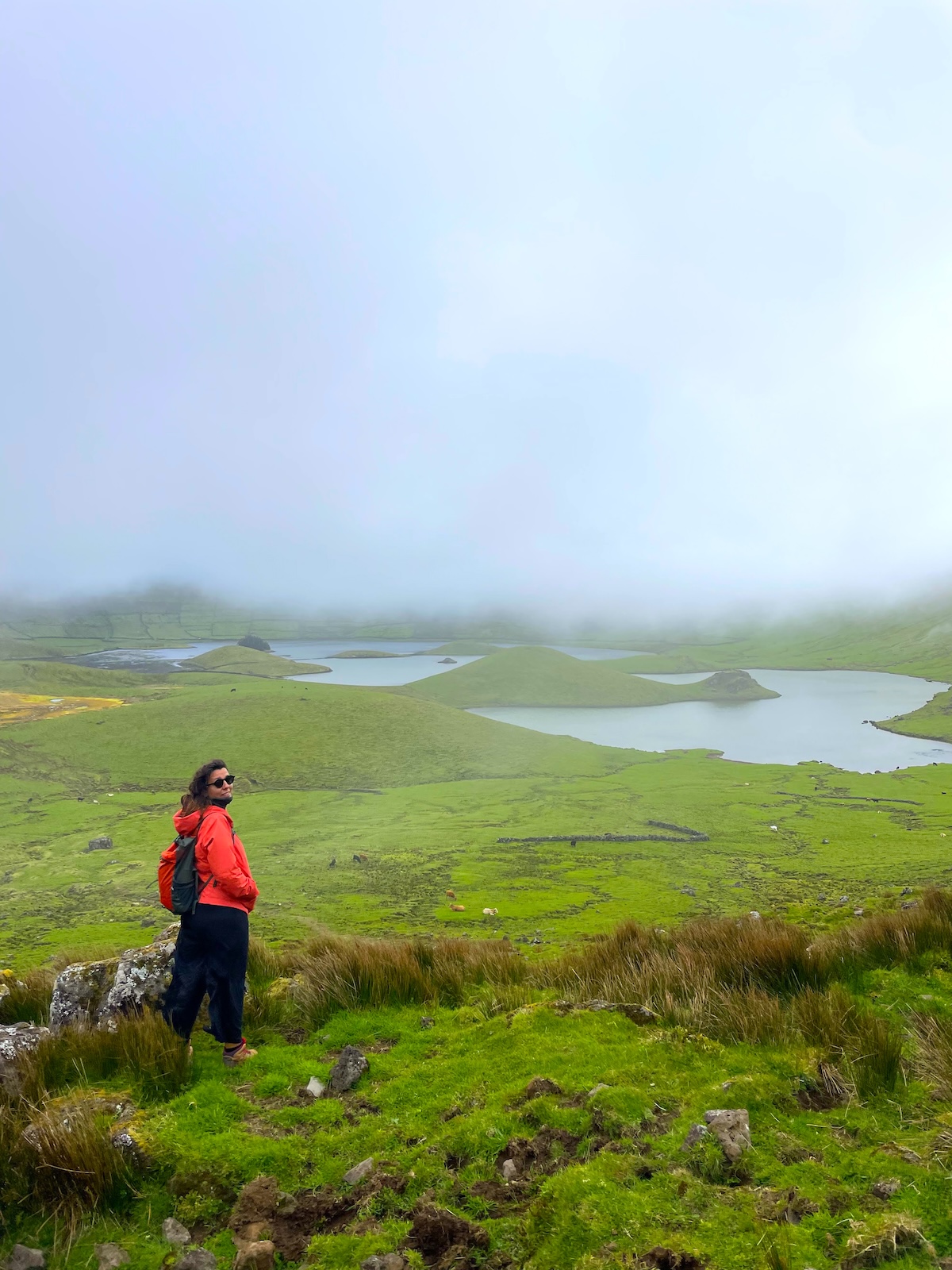 Durante la nostra seconda visita a Corvo, nel 2025, e nonostante il tempo non fosse molto favorevole (dall’alto si vedeva a malapena il Caldeirão a causa delle nuvole e il vento era molto forte), eravamo determinati a percorrere il sentiero fino al suo interno, con la speranza che il tempo migliorasse nel corso della giornata. E così è stato! Anche se non si è schiarito del tutto, abbiamo potuto goderci la passeggiata quasi in solitudine e dei paesaggi incredibili.